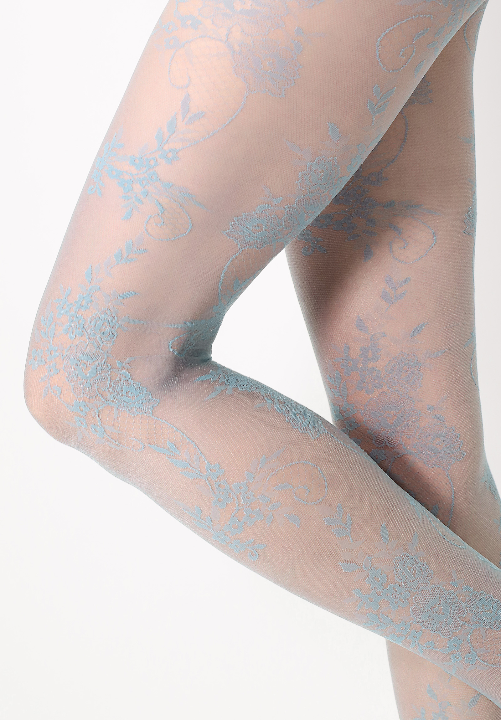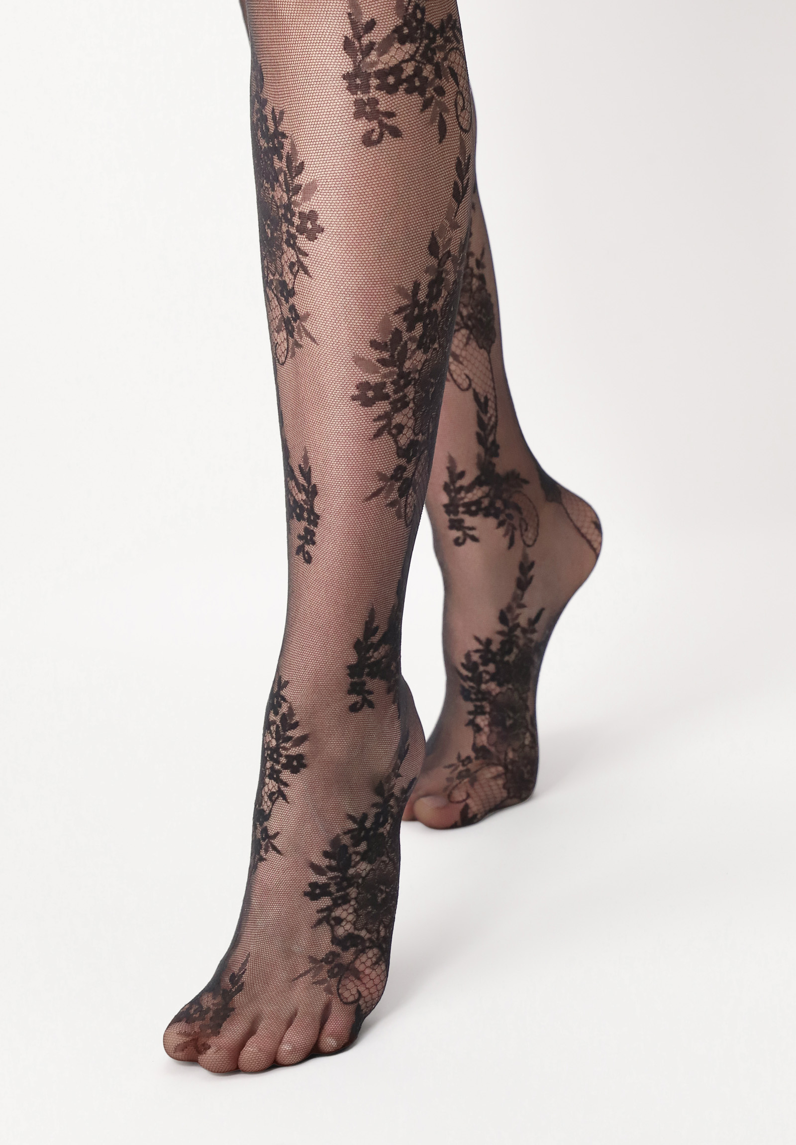 Voeg een vleugje elegantie en vrouwelijkheid toe aan je garderobe met onze transparante panty met kant-effect, versierd met een subtiel bloemenpatroon. De comfortabele tailleband, platte naden en kruisje garanderen uitzonderlijk comfort de hele dag door.