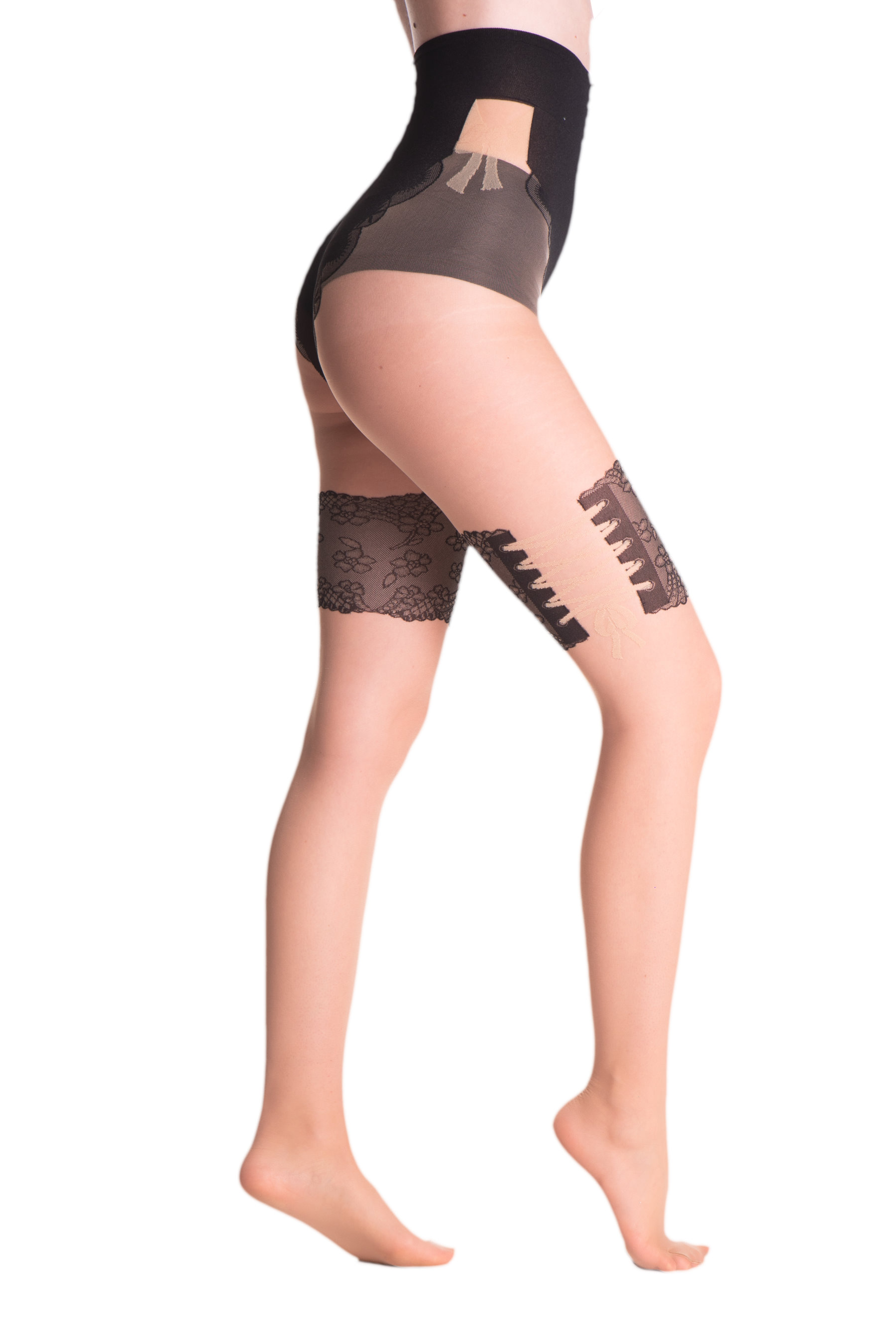 Exclusieve panty met verleidelijk kousenmotief en fantasieslip.