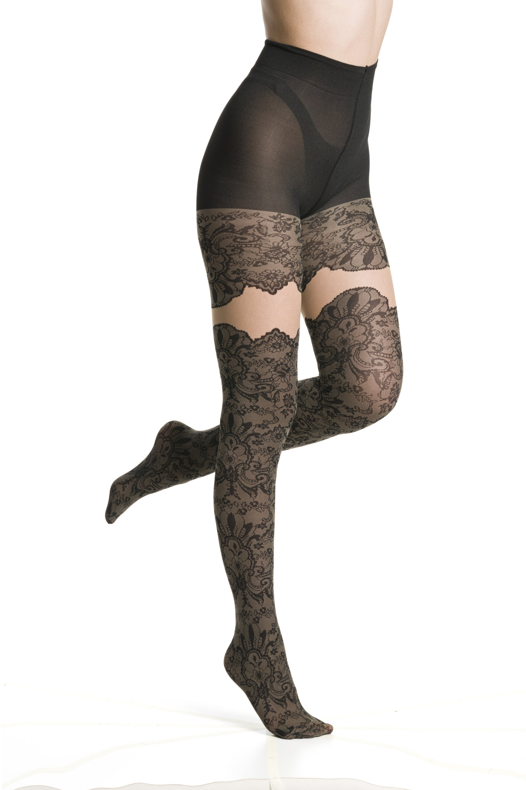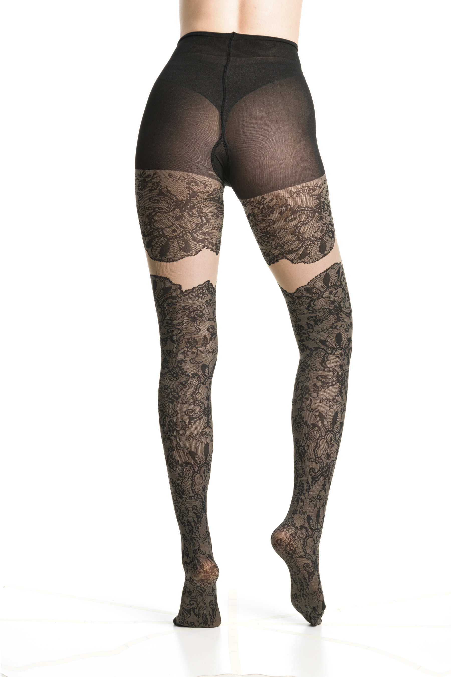 Exclusieve, semi-opaque panty met verleidelijk kousenmotief en kantpatroon. 20 denier/50 denier...meer
